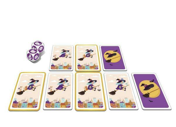 Ein Ausritt auf dem Hexenbesen ist für alle ein großer Spaß - Hexe und Tier. Doch irgendeiner hat wieder gebummelt und den Abflug verpasst. Wer ist es dieses Mal? Die zwei Tierwürfel zeigen, welche Tiere gesucht werden müssen. Gefunden? Dann die entsprechenden Karten umdrehen und mit etwas Glück am Ende die meisten Karten von den Mitspielern eingeheimst haben.