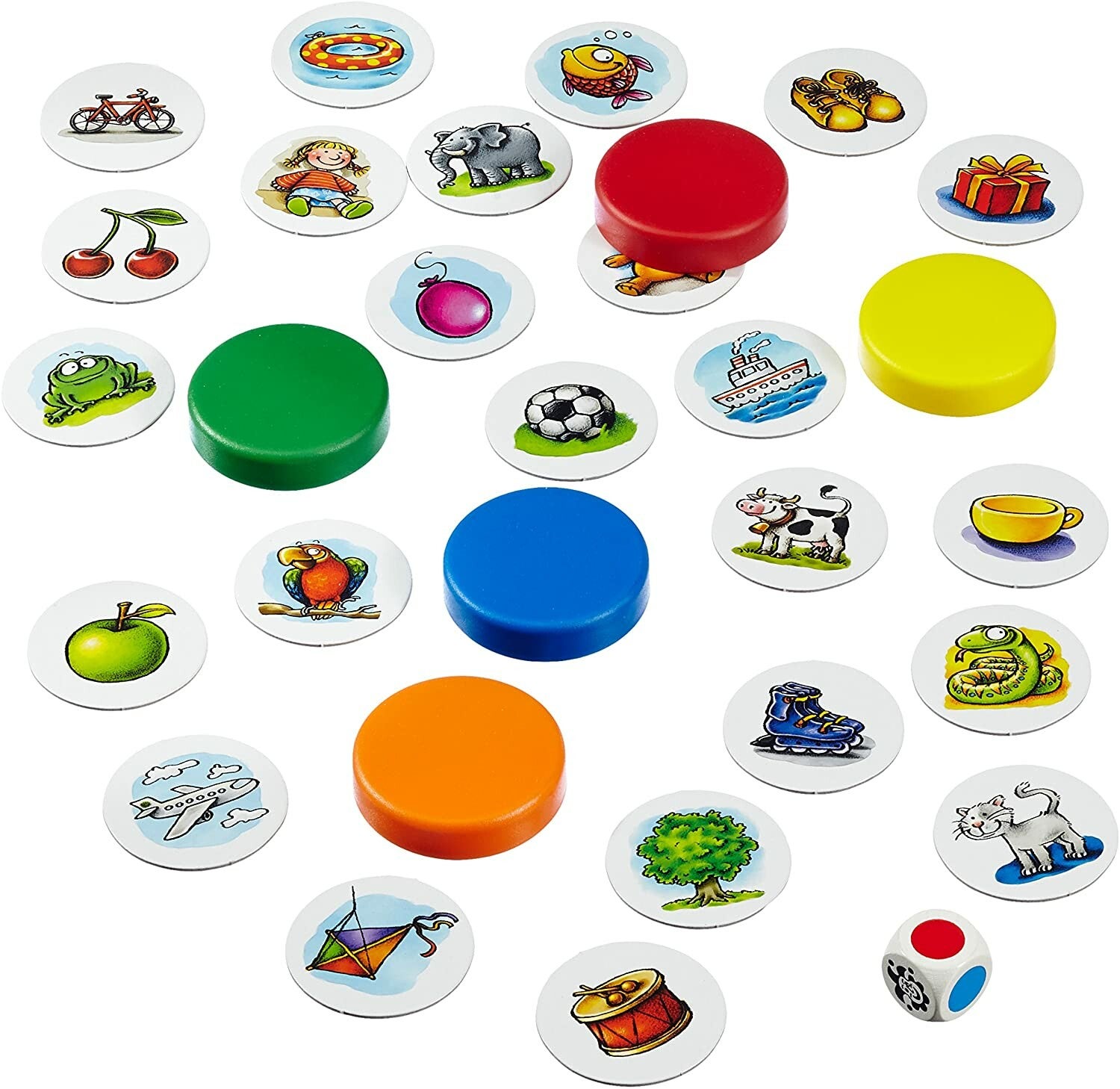 Wer merkt sich am besten, was unter den bunten Deckeln verborgen ist? Jeder weiß noch: Die Katze liegt unter dem roten, der Teddy unter dem blauen. Doch der Würfel zeigt Grün: Verflixt, was versteckt sich unter dem grünen Deckel