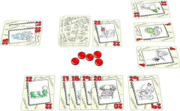 Aus dem Leben eines Pechvogels! Mit dem falschen Fuß aufgestanden? Seid daher auf der Hut,wenn eine Karte mit einer unangenehmen Situation offen auf dem Tisch liegt.Ihr habt die Wahl.Wendet das Unglück mit einer Chipkarte ab oder nehmt die Minuspunkte an.Der Spieler mit den wenigsten Minuspunkten gewinnt.